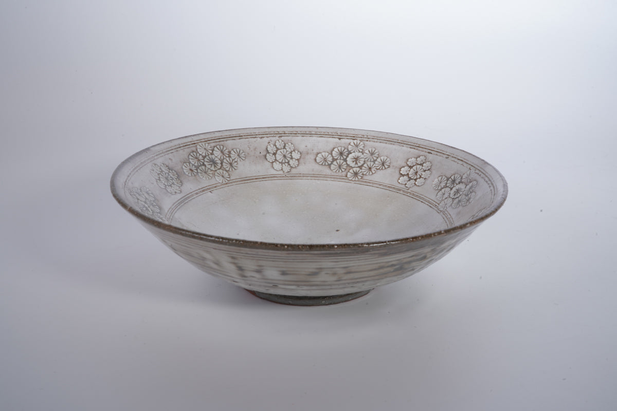 It is decorated with two different techniques: a Mishima-te floral pattern, in which a seal is pressed onto the pottery, and a floral pattern in which three-dimensional effects are created by heaping up the ceramic clay.